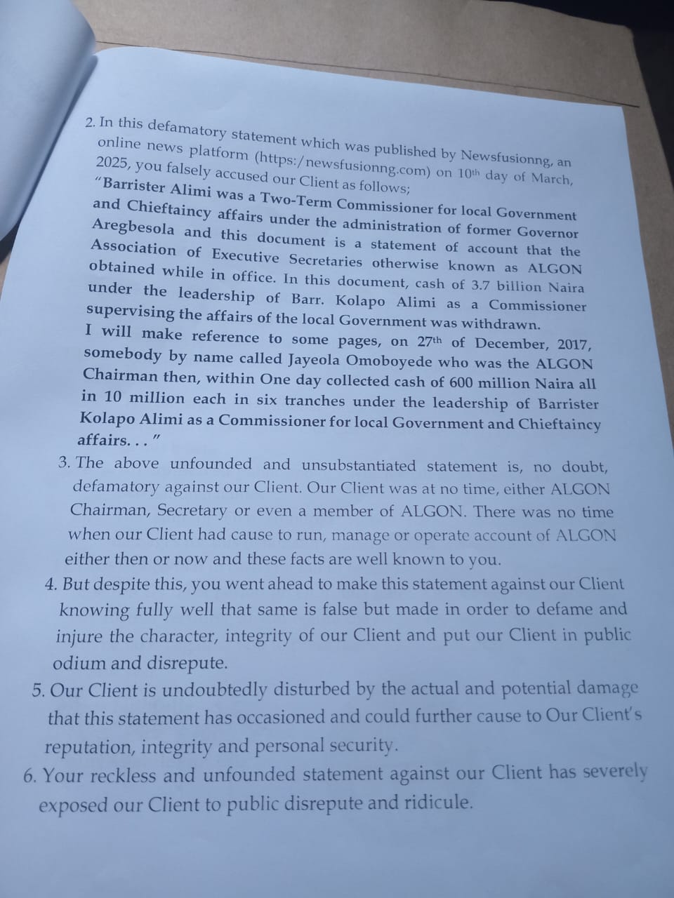 “For the umpteenth times, I, Oluomo Kolapo Alimi, is using this opportunity to tell him and others in his sinking ship that, my decision to take him to a competent court of law for blackmailing me is not a threat as any moment from now, he will hear from my team of lawyers who are already working round the clock in that regard.